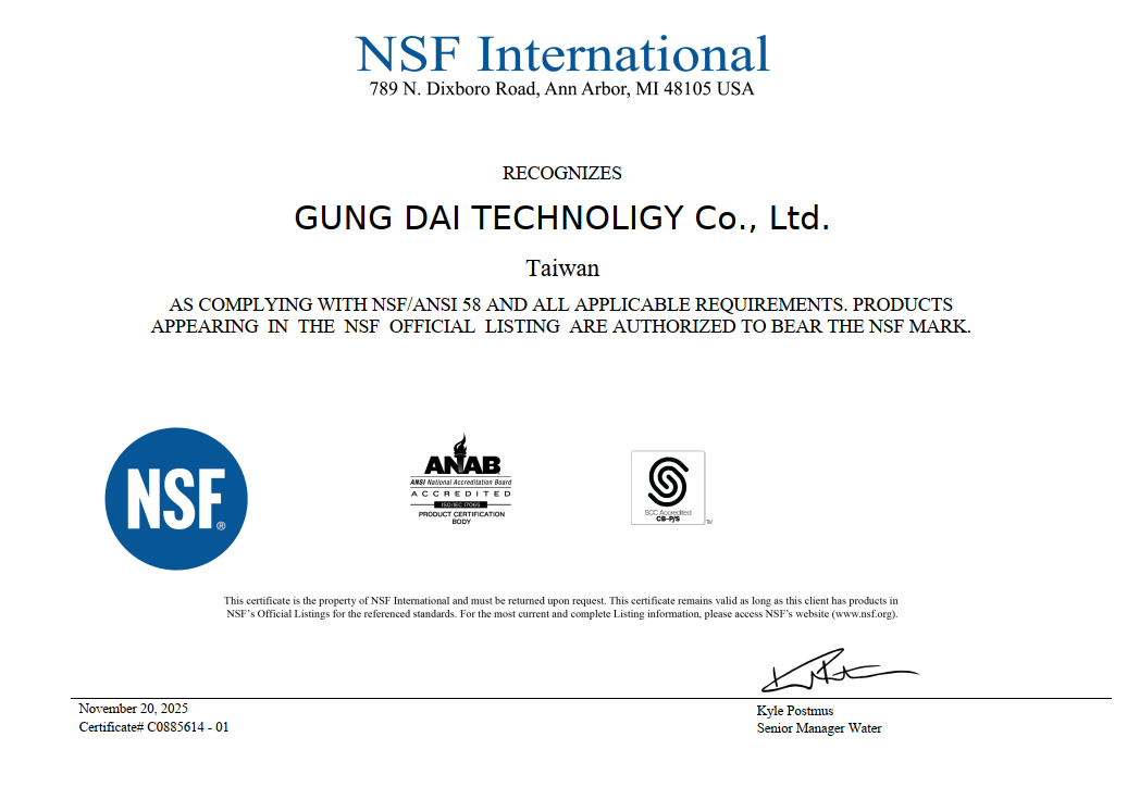 Dear GUNGDAI Clients, We have truly exciting news to share about another milestone that we have made again. We are immensely proud to announce that the GUNGDAI GD IZERO Reverse Osmosis System has successfully obtained the rigorous NSF/ANSI 58 full system certification!